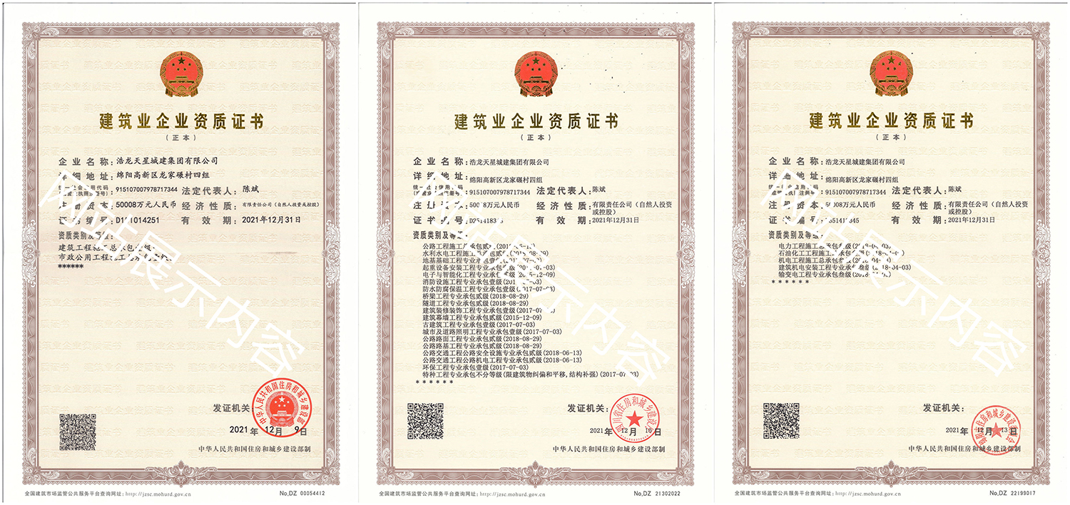 浩龍?zhí)煨浅墙瘓F有限公司,2007年成立于“李白故鄉(xiāng)、中國科技城”—四川省綿陽市,企業(yè)注冊資本金5.0008億元。公司共有27項建筑業(yè)企業(yè)資質,其中國家一級資質11項,二級資質10項,三級資質5項,特種資質不分等級1項,類別涵蓋建筑、市政、水利、機電、隧道、起重設備安裝等基礎及未來發(fā)展重點專業(yè)。公司下設三個辦事處,業(yè)務范圍輻射全國,在建項目三十余個,累計完成產(chǎn)值超11億元。公司是綿陽市建筑施工企業(yè)協(xié)會副會長單位、綿陽遂寧商會會長級單位、綿陽首批建筑業(yè)綠卡企業(yè),在綿陽本地企業(yè)中綜合實力名列前茅。